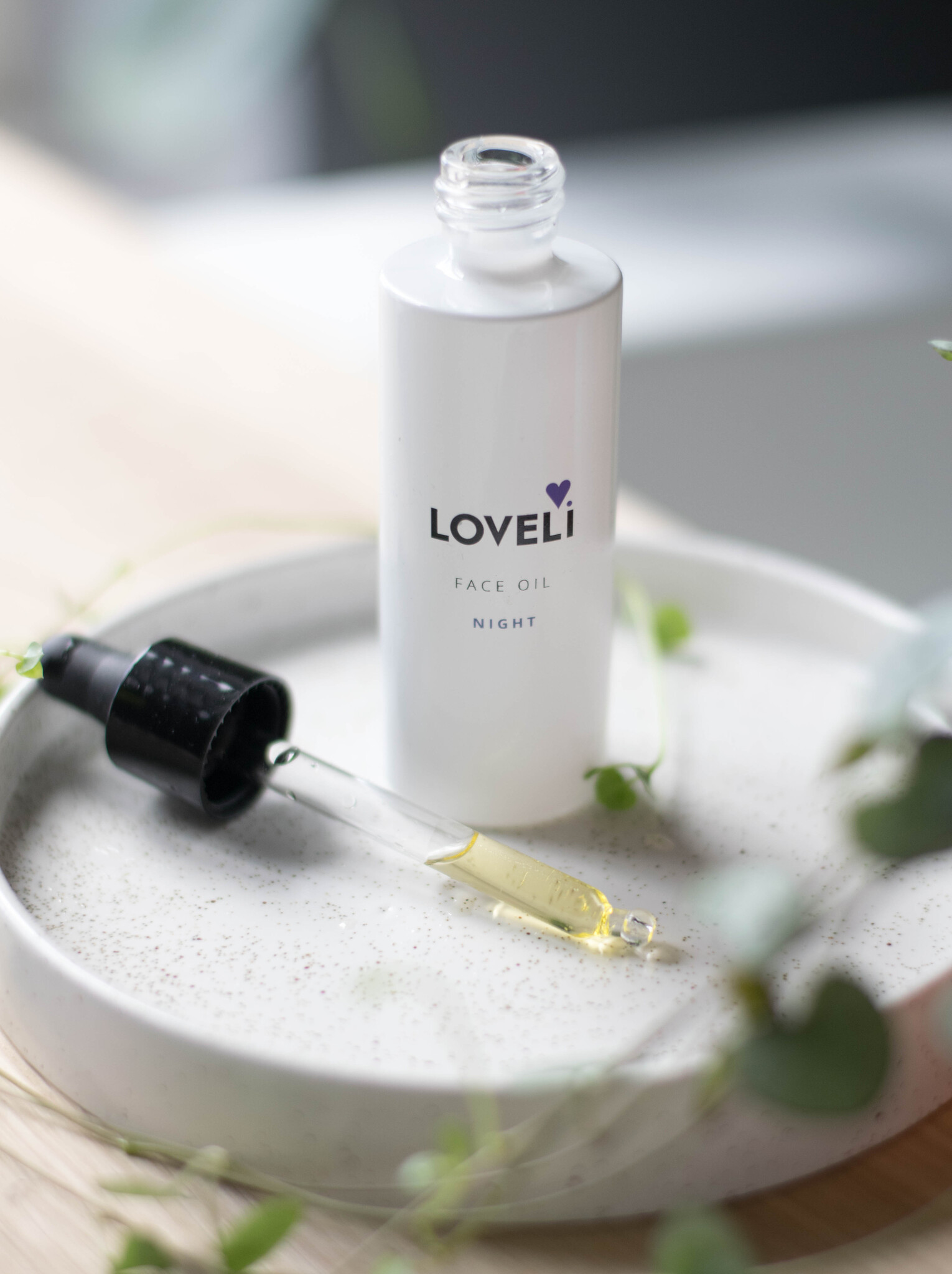 De Loveli Face Oil Night is speciaal ontwikkeld om je huid ’s nachts optimaal te laten herstellen van alles wat ze overdag te verduren krijgt, zoals zonlicht, wind, airco en luchtvervuiling. Deze rijke gezichtsolie bestaat uit bijna 100% pure oliën, waaronder wilde rozenolie en komkommerzaadolie, die diep in de huid trekken en zorgen voor intens herstel, hydratatie en meer elasticiteit. In tegenstelling tot nachtcrèmes – die vaak grotendeels uit water bestaan – bevat deze olie vrijwel alleen werkzame stoffen, aangevuld met vitamine E als antioxidant. Dankzij de opwekkende geur van roos voelt je avondritueel extra fijn en ontspannen aan. Gebruik een paar druppels op je gezicht, hals en eventueel decolleté na de face wash en face mist, en laat de olie ’s nachts haar werk doen. Voor overdag is er de lichtere Loveli Face Oil Day, want de oliën in de Night-variant zijn lichtgevoelig.